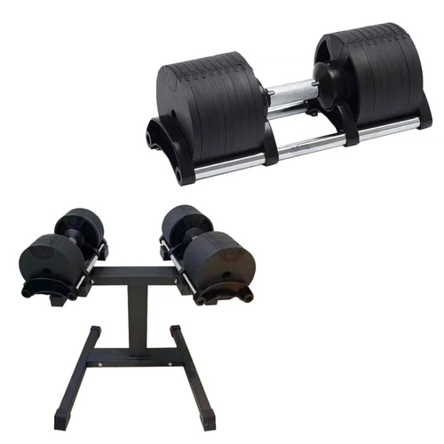 Par de mancuernas ajustables de 2,5 a 32 kg con sistema de selección rápida mediante giro de muñeca. Ideales para entrenar en casa o en gimnasios con máximo ahorro de espacio.